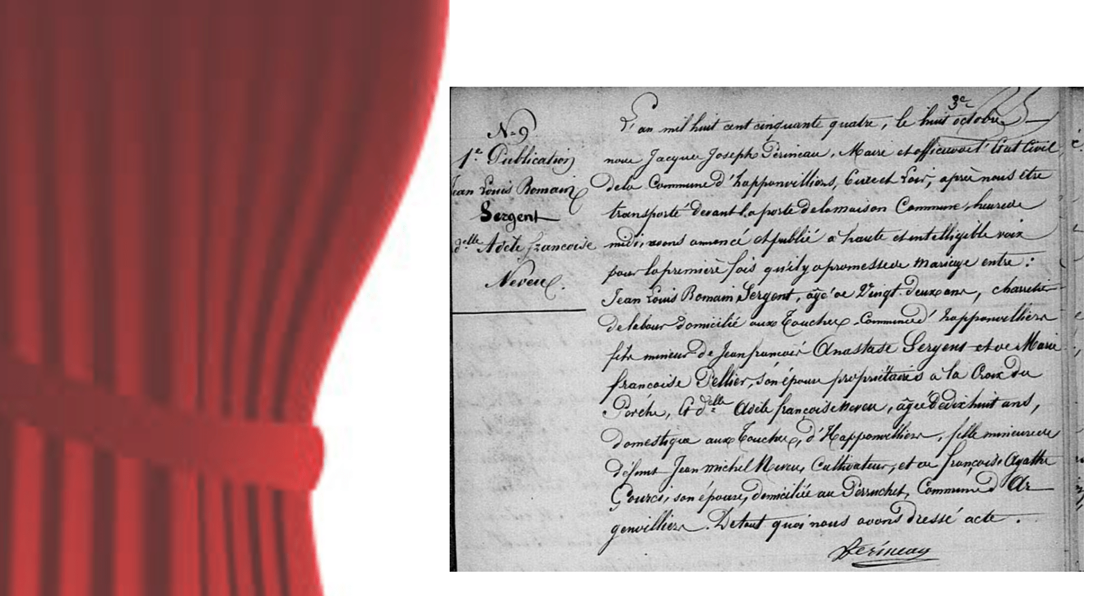 Voilà comment nous pouvons imaginer la matinée d’Agathe Françoise GOURCI en ce jour de 1854 : Elle doit se presser de faire ses corvées, car aujourd’hui, 15 octobre, seront annoncées sur la place du village les promesses du jeune homme envers sa fille Adèle Françoise Louise. Elle est heureuse Agathe et se presse pour avoir un peu de temps pour s’apprêter. Sa vie n’a pas été toute rose mais elle est fière que sa fille ait trouvé un homme. Elle se souvient le jour de ses premières noces : Elle était à peine âgée de 20 ans, elle, la petite GOURCI de Frazé avait trouvé la sécurité d’un foyer dans la maison de Jean Michel NEVEU à la Croix du Perche ( en Eure-et-Loir 28), le 09 Février 1830. Il était temps comme diraient certaines mauvaises langues, son ventre commençait à montrer le résultat de belles galipettes clandestines dans les champs !! Son Jean Michel lui a donné 3 belles filles avant de s’éteindre en 1840 alors que la dernière avait à peine 2 ans.