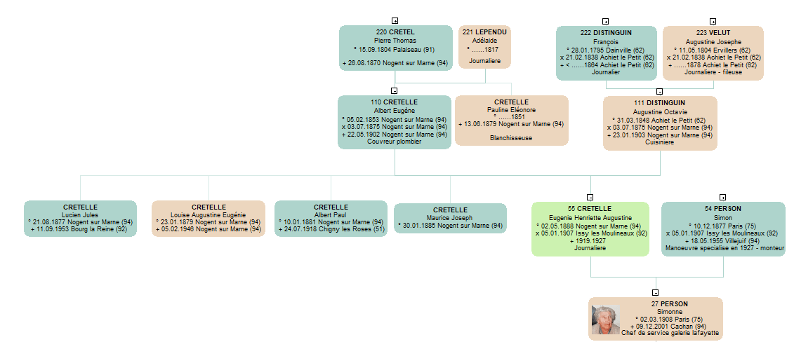 A Nogent-sur-Marne, en 1888, le 02 Mai exactement, Eugénie Henriette Augustine CRETELLE ouvre les yeux. Elle est la fille d’ Albert Eugène et de Augustine Octavie DISTINGUIN, benjamine d’une fratrie de 5 enfants. Je ne sais pas comment Eugénie a vécu son enfance dans cette ville en plein développement, avec l’arrivée du chemin de fer et l’installation des guinguettes le long de la Marne : La ville devient, dans la mémoire collective, comme l’un des lieux de naissance des loisirs de masse.