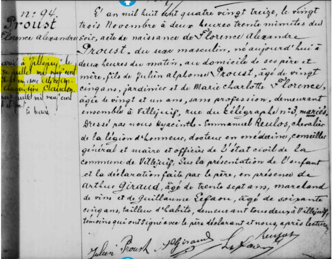 Il y a des gens comme ça, qui traversent votre enfance, votre vie avec des « petits noms ». C’est le cas de la « tante PROUST ». Régulièrement, nous allions rendre visite à la mamie ANDRY, née Simonne PERSON et nous descendions quelques mètres dans le sentier Karl Liebknecht à Villejuif pour dire bonjour à la tante PROUST. J’ai toujours pensé que c’était une simple relation de voisinage qui, avec le temps, s’était transformée en une profonde amitié entre les deux vieilles dames. Et puis vient le temps de la généalogie et des questions à la famille : Mais qui est vraiment la tante « PROUST » ?