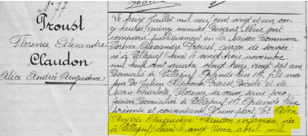 L’acte de mariage en date du 13 juillet 1921 répond à toutes mes interrogations ! En effet Alice Andrée Augustine CLAUDON, infirmière, est née le 22 Avril 1900 à Villejuif et est la fille de Louis Augustin CLAUDON et Augustine Marie HULLIN