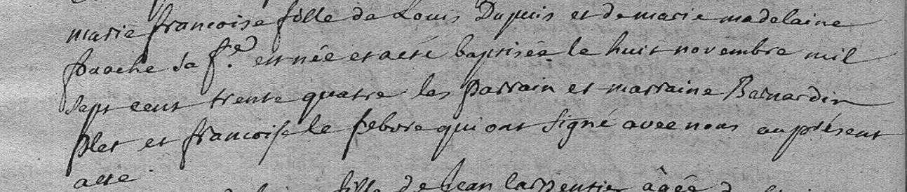 Il y a bon nombre de petits détails intéressants dans ce document si l’on arrive a décrypter l’écriture. Notamment la précision de les parents sont de cette paroisse et son age. Au vue des précisions portées dans la rédaction de cet acte, nous pouvons retenté la chance en cherchant son acte de baptême 22 ans plutôt. Soit, après quelques pages de lecture nous découvrons que Marie Francoise DUPUIS a été baptisée le 08 Novembre 1734, toujours à Fontenay-Torcy :