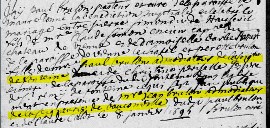 Plusieurs points peuvent être soulignés dans cet acte : Le pasteur et curé de la paroisse de la Marne porte le même nom de famille, y-aurait-il un lien familial caché ? Parmi les témoins, on constate qu’un autre homme BRULON, nommé Jean, est lui aussi Admodiateur de la seigneurie de Bauconville. Fait il aussi partie de notre lignée BRULON ?