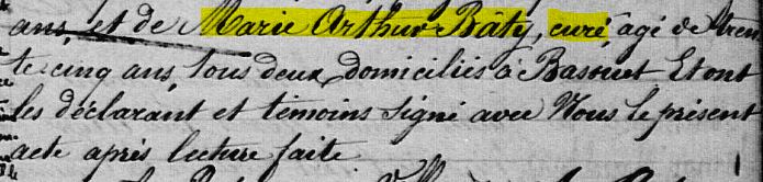 C’est en cherchant les descendances de ses frères que je découvre la profession de Marie-Arthur, notamment lors de la naissance de sa nièce Marie Alixe Marcelle BATY, sœur ainée de notre sosa et arrière-grand-père Marie Charles Alfred , le 13 Mai 1890 à Bassuet.