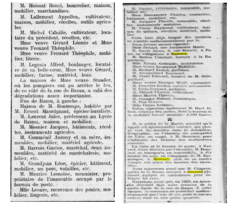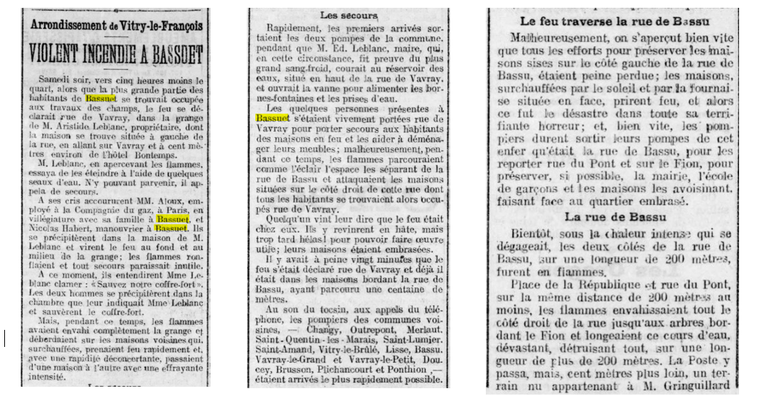 Le samedi 29 Juillet 1911, Bassuet fut victime des flammes. L’indépendant rémois relate avec précision la circulation des flammes au coeur du village ainsi que la détresse des habitants. Au final, en l’espace d’une heure, ce sont 29 habitations qui sont réduites en cendres.