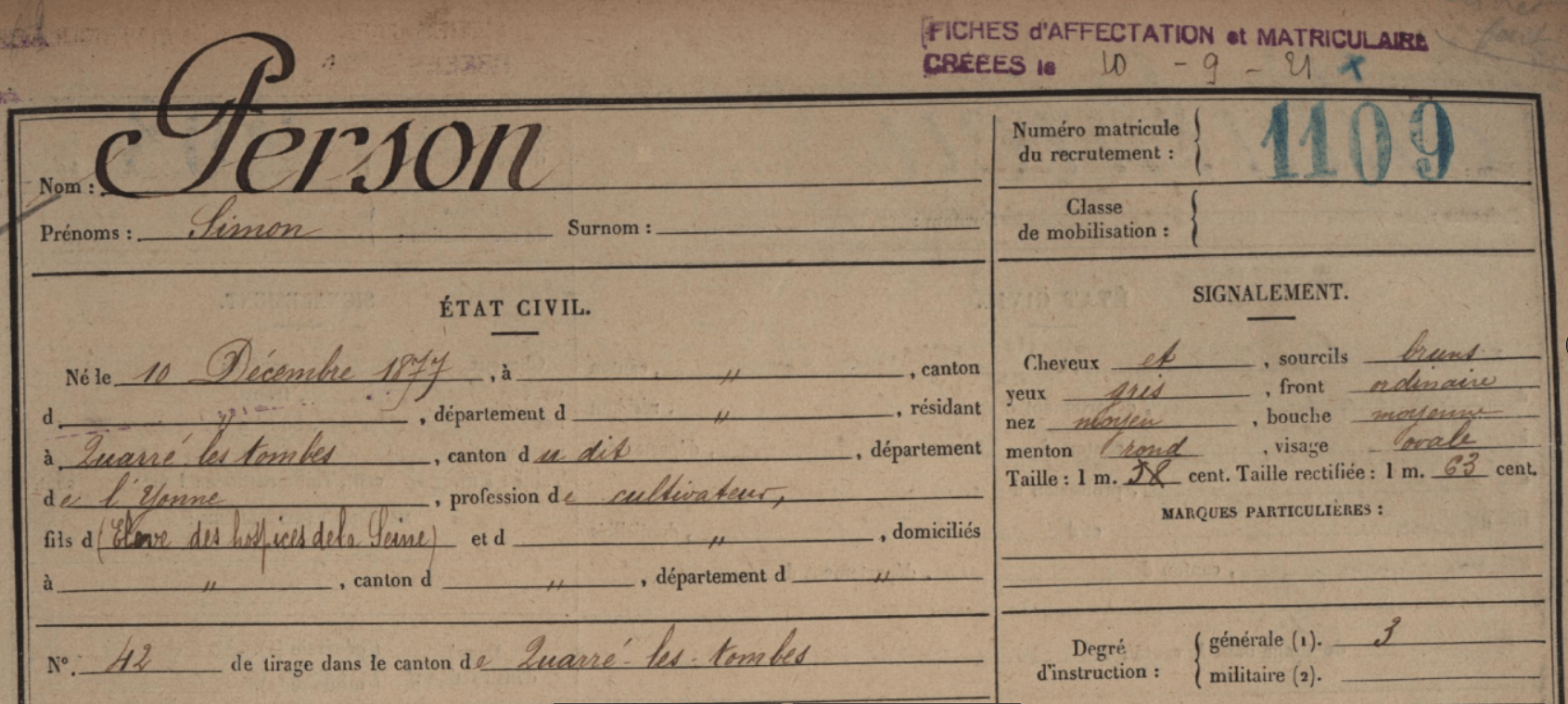 J’entreprends de fouiller dans les archives de Paris des enfants abandonnés à partir de 1886 et je retrouve bien un certain Simon PERSON enregistré sous le matricule 5477 de l’année 1888.