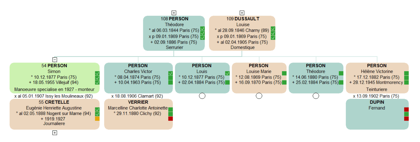 Né le 10 décembre 1877 dans le XV -ème arrondissement de Paris, Simon PERSON est le jumeau de Louis né 10 minutes plus tôt. Son père Théodore est serrurier, sa mère Louise DUSSAULT, simple domestique. S’il n’y a aucune mention marginale sur l’acte de naissance de Louis, il y en a une sur celui de Simon. Ainsi, nous apprenons qu’il épouse Eugénie Henriette Augustine CRETELLE le 05 janvier 1907 à Issy les Moulineaux. Leur mariage est à lui seul une première dans notre généalogie : Eugénie Henriette Augustine CRETELLE