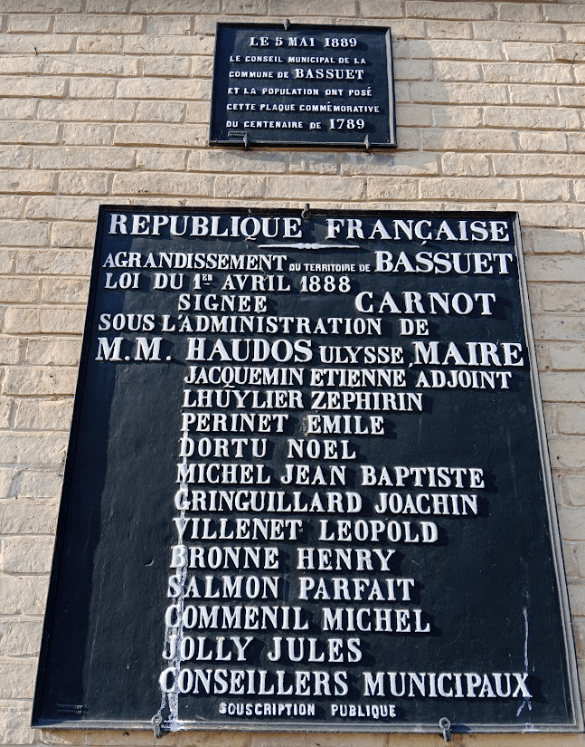 Le 5 mai 1889 le conseil municipal de la commune de Bassuet et la population ont déposé une plaque commémorative du centenaire de 1789. En dessous de celle-ci, une autre plaque stipule l’agrandissement du territoire de Bassuet selon la loi du 1er avril 1888 signé Carnot sous l’administration de Haudos Ulysse Maire et de tous ses conseillers municipaux.