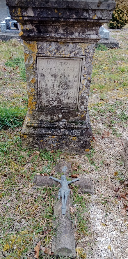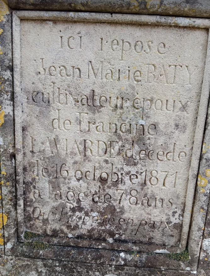 Dans le cimetière, j’ai découvert Jean Marie BATY décédé le 16 Octobre 1871, originaire de Cernay-en-Dormois et son épouse Marie Françoise LAVIARDE , décédée le 10 Avril 1850. Ce couple correspond à la cinquième génération après mon grand-père maternel