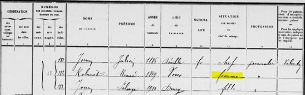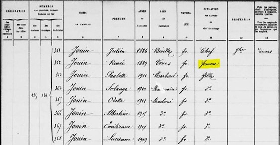 Eh bien quelle vie ! Peut être se sont-ils rendus compte qu’elle n’avait pas épousé le bon frère, en tout cas le recenseur n’a pas cherché plus loin, elle portait le nom de famille JOUIN, habitait avec lui donc c’était sa femme et non sa belle-soeur, surtout si le vrai mari n’était jamais là