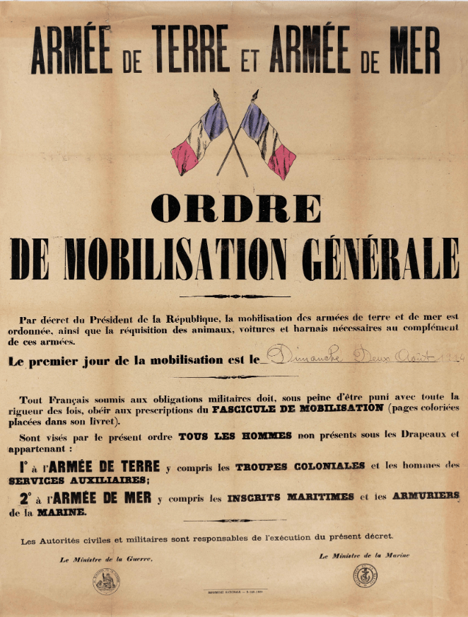 Celle que l’on appellera « la Grande Guerre » démarre par l’assassinat de l’Archiduc d’Autriche le 28 juin 1914. Dès lors, des alliances se forment, l’Europe s’embrase et la mobilisation générale française est déclarée par le « décret prescrivant la mobilisation des Armées de terre et de mer du 1er août 1914 », publié au Journal officiel du 2 août de la même année.