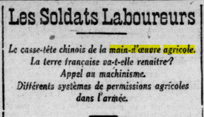 Le 12 janvier 1917, le ministre de la Guerre diffuse une circulaire mettant à disposition les classes 1888 et 1889 comme main-d’œuvre agricole pouvant bénéficier d’un détachement. Cette mesure s’accompagne de la création d’une administration chargée de la gestion de cette main-d’œuvre et dont l’objectif est de maintenir voire augmenter à tout prix la production du sol national alors que la main-d’œuvre habituelle manque de plus en plus