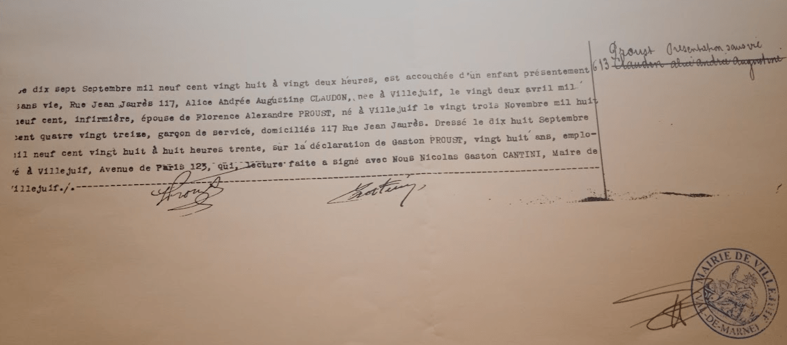 Regarde par toi-même : Le dix sept septembre 1828 à 22 heures, est accouché d’un enfant présentement sans vie, tue Jean Jaurès 117, Alice Andrée Augustine CLAUDON, née à Villejuif , le 22 avril 1900, infirmière, épouse de Florence Alexandre PROUST, né à Villejuif le 23 novembre 1893, garçon de service, domicilié 117 rue Jean Jaurès …