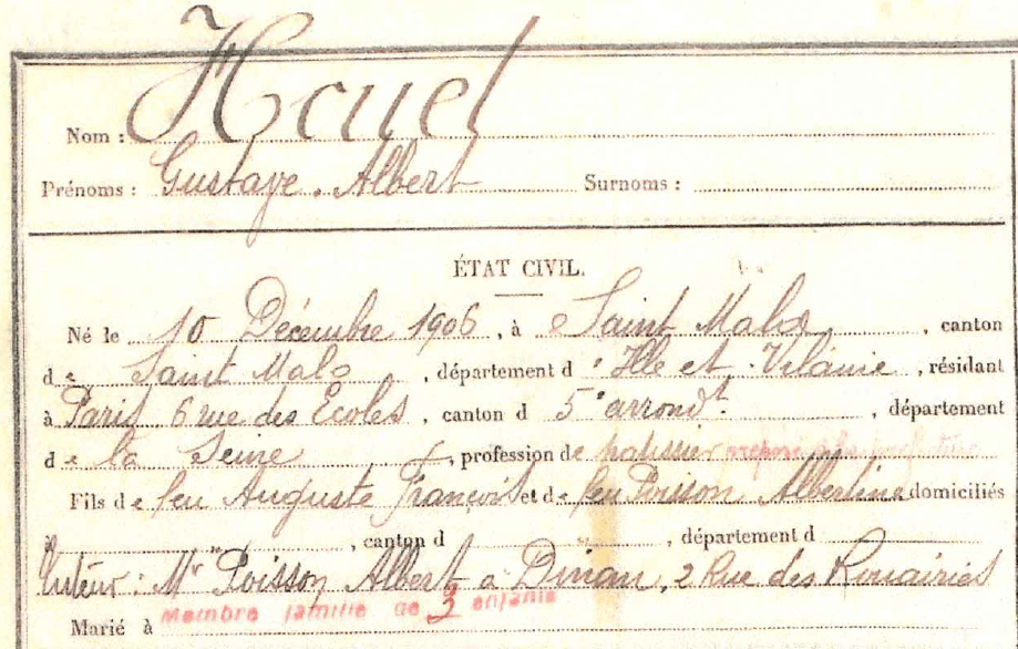 Un patronyme plutôt très commun, me direz vous. Effectivement selon généanet, il est répertorié plus de 360 000 fois sur la période allant de 1800 à 1900 sans avoir une région bien spécifique. Mais c’est au coeur de la cité malouine qu’il apparaît dans notre arbre avec Albertine Reine POISSON qui épouse le 07 Janvier 1907 HOUEL Auguste François, qui deviendront les heureux parents de Gustave Albert.