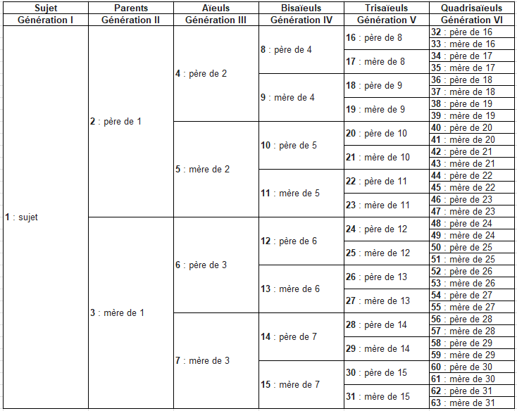 C’est une façon très pratique de ranger les numéros de tous tes grands-parents et de leurs parents ! Le numéro de chaque personne ne change jamais, et cela aide à bien faire son arbre de famille. Voici un petit tableau sur plusieurs générations pour bien comprendre :